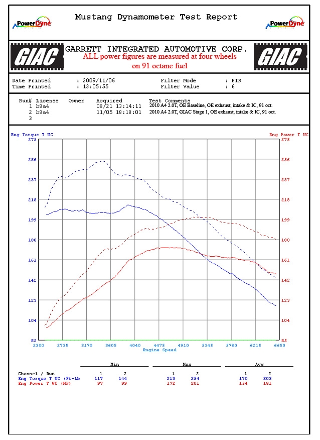 Gains are measured at 30 wheel HP and 42 ft lbs of wheel torque over stock with factory intake and exhaust on 91 octane fuel. GIAC software for the 2010 6MT A4s features dramatic throttle reconfiguration for a smoother driving experience and a more drive-by-cable-like throttle feel.